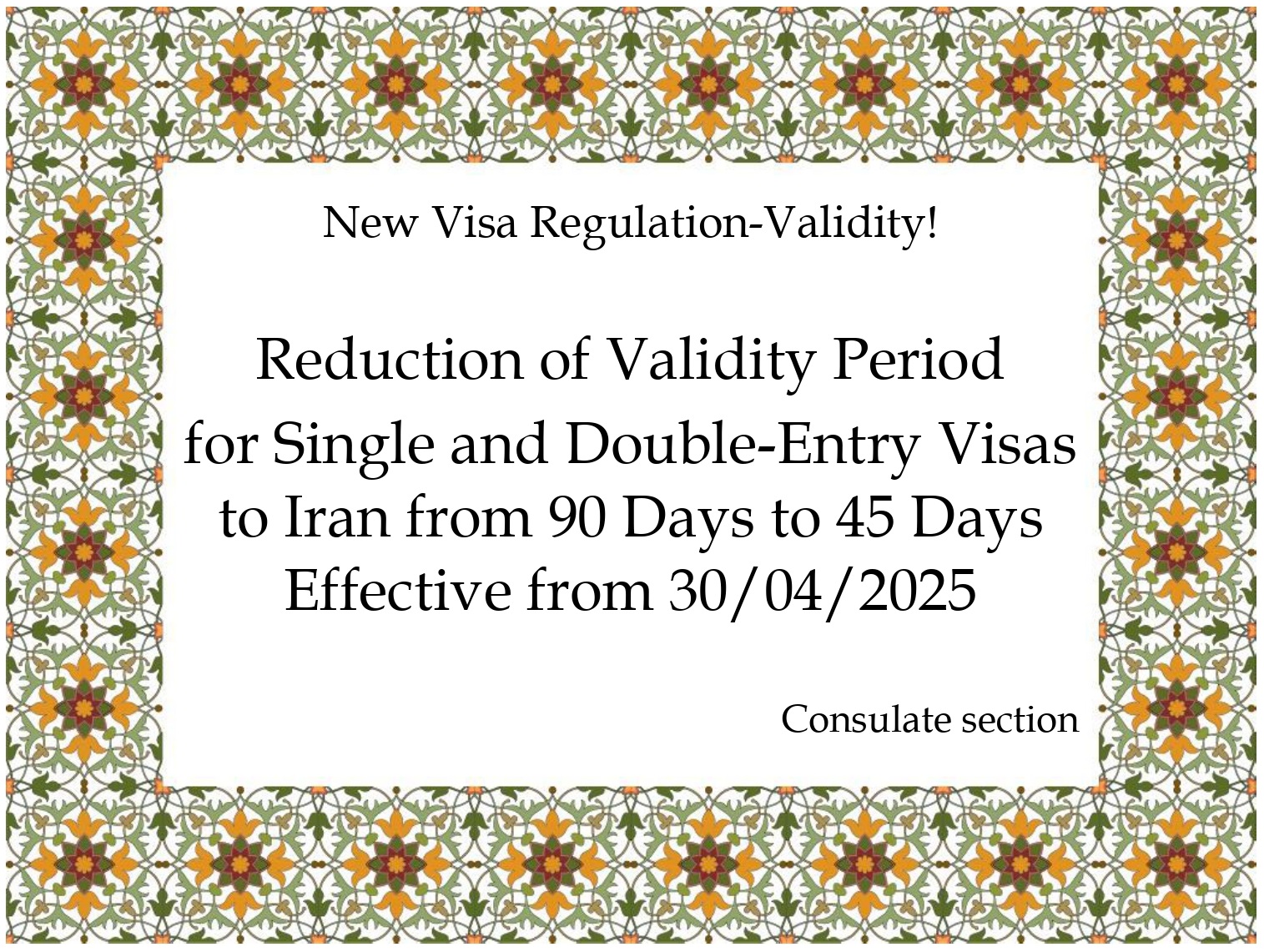 Reduction of Validity Period for Single and Double-Entry Visas to Iran from 90 Days to 45 Days Effective from 30/04/2025.