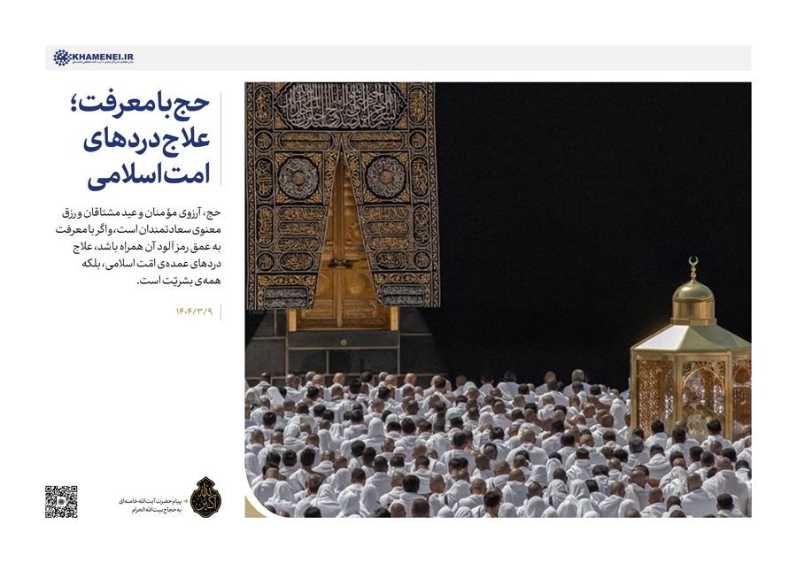 حضرت آیت‌الله خامنه‌ای رهبر انقلاب اسلامی در پیامی‌به مناسبت موسم حج امسال، حجِ همراه با معرفت و درس‌های آن را علاج دردهای امروز دنیای اسلام برشمردند و با اشاره به جنایات و شقاوت‌های رژیم صهیونی در غزّه، مهمترین وظیفه دولت‌های اسلامی را مانع شدن از ادامه فاجعه بشری در غزه و فشار به آمریکا به‌عنوان حامی اصلی رژیم صهیونی برای توقف کمکها و حمایتها دانستند و از ملتها خواستند مطالبه‌گرِ عمل دولتها به این وظیفه باشند.