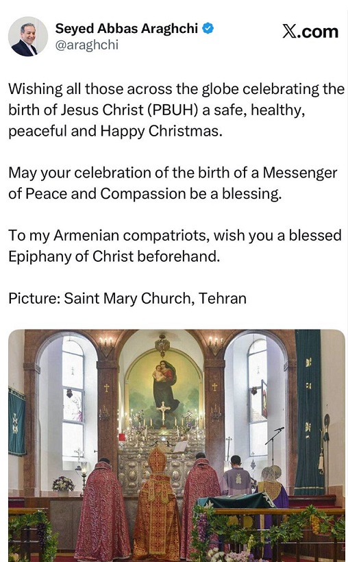 آقای دکتر سید عباس عراقچی وزیر امور خارجه جمهوری اسلامی ایران در پیامی در شبکه ایکس (توئیتر) سالروز میلاد حضرت مسیح (ع) را تبریک گفت.