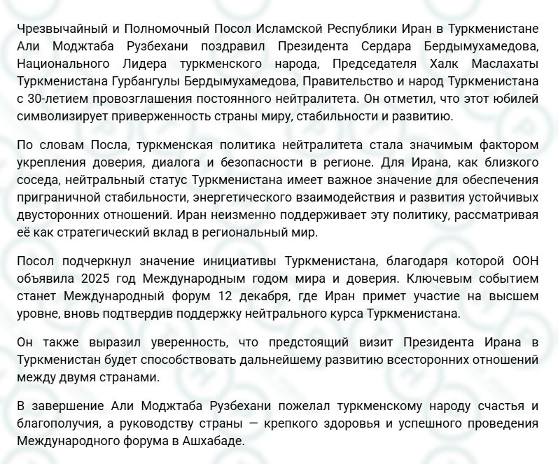 Публикация поздравительного послания посла Исламской Республики Иран по случаю 30-летия провозглашения нейтралитета Туркменистана