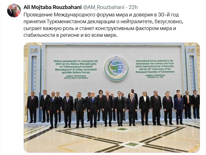 Публикация поздравительного послания посла Исламской Республики Иран по случаю 30-летия провозглашения нейтралитета Туркменистана