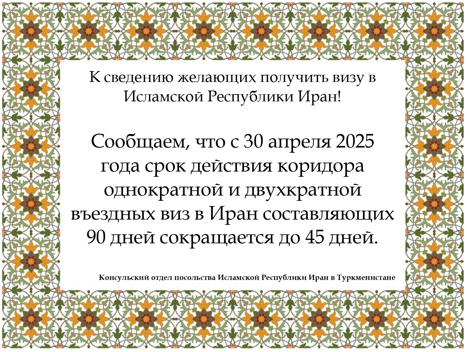 Сообщаем, что с 30 апреля 2025 года срок действия коридора однократной и двухкратной въездных виз в Иран составляющих 90 дней сокращается до 45 дней.
