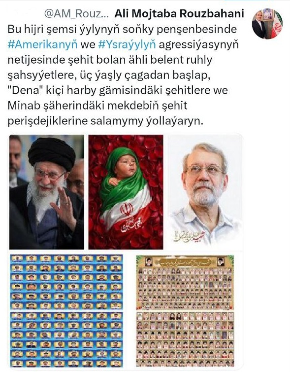 Bu hijri şemsi ýylynyň soňky penşenbesinde Amerikanyň we Ysraýylyň agressiýasynyň netijesinde şehit bolan ähli belent ruhly şahsyýetlere, üç ýaşly çagadan başlap, "Dena" kiçi harby gämisindäki şehitlere we Minab şäherindäki mekdebiň şehit perişdejiklerine salamymy ýollaýaryn.