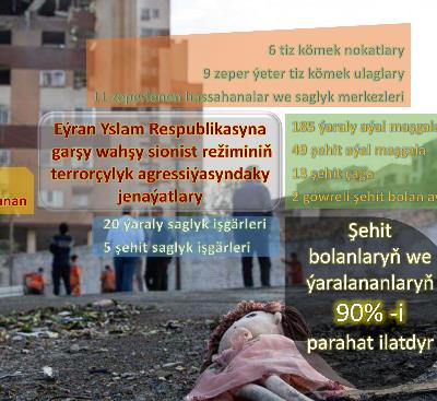 Terrorçylykly sionistik režimin Eýranyň dürli şäherlerinde ilatly ýerlere, hassahanalara, tiz kömek ulaglaryna, halas ediş işgärlerine, dermanhana merkezlerine hüjüm etmegi bigünä harby däl adamlaryň, şol sanda zenanlaryň we çagalaryň şehit bolmagyna we ýaralanmagyna getirdi. Munuň özi harby däl adamlara we harby däl infrastrukturalara gönükdirilen hüjümleri harby jenaýat hökmünde kesgitleýän halkara kanunlarynyň gös-göni bozulmagy hasaplanylýar.