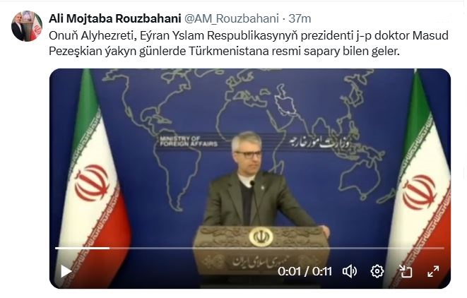 Eýran Yslam Respublikasynyň ilçisiniň X (Twitter) kanalynda neşir eden ýüzlenmesi: Onuň Alyhezreti Eýran Yslam Respublikasynyň prezidenti j-p doktor Masud Pezeşkian ýakyn günlerde Türkmenistana resmi sapary bilen geler.