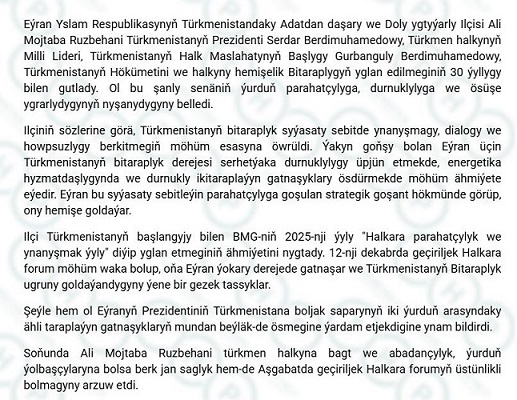 Türkmenistanyň Bitaraplygynyň otuz ýyllyk baýramy mynasybetli Eýran Yslam Respublikasynyň Türkmenistandaky ilçisiniň gutlag ýüzlenmesi neşir edildi